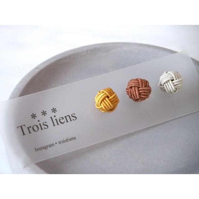 伝統ある水引を使った玉結びのピアス 個人的に絶妙な色合い♪と思う3色をセットにしました* -茶- 金茶*淡茶*栗鼠 -藍- 藍色*薄墨色*ベージュ -淡- ベージュ*栗鼠*白 -桜- 青磁色*灰桜*栗鼠 *こちらは -茶- の購入ページです* その日のファッションや気分に合わせて好みの色を組み合わせてください 3パターンの組み合わせが叶うオリジナルピアスで ちょっとオシャレなシンプルコーディネートを♡ 備考欄でピアスorノンホールピアスをお知らせください∗ −−−−−−−−−−−−−−−−−−−−−−−−−−−−−− 素材▶水引 ピアス金具/サージカルステンレス ノンホールピアス/樹脂 −−−−−−−−−−−−−−−−−−−−−−−−−−−−−− *水引作品の取り扱い 扱っている水引はこより状の和紙や紙に繊維を巻きつけたものです 大変繊細な素材となっておりますので 水に浸けたり、長時間湿り気のあるのもに添えたりしないように お気をつけください 強く押さえたり、引っ張ったりせず、なるべく丁寧に扱ってください ご購入に関してのお願い* ・作品に関して ハンドメイド作品ですので, ひとつひとつの作品に個体差がございます 色味やサイズ感が写真と異なる場合がございます ・発送に関して ご依頼頂いた作品は 丁寧に梱包して発送させていただきますが 個人の自宅での製作,発送になりますので ご理解のほどよろしくお願いいたします ・返品/交換に関して ご注文確定後のキャンセルを含め 返品/交換は出来かねますのでご了承くださいませ 商品に不備はあった際にはご連絡ください